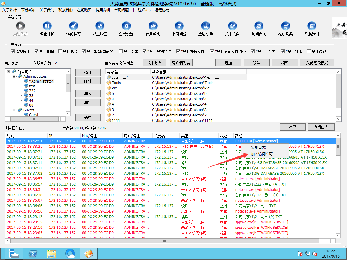 为了防止访问者通过第三方软件访问共享文件时,可能获得较高的共享文件访问权限,甚至破坏、泄露服务器共享文件的行为。大势至共享权限设置软件特别集成了“访问许可”设置功能,只有加入到“访问许可”的程序才可以访问共享文件,否则将会一律予以阻止,从而保护了共享文件的安全。设置方法也极为简单: