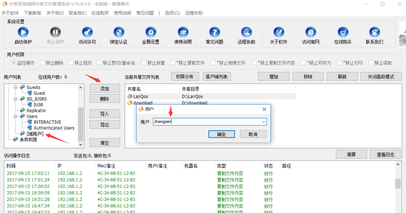 大势至共享文件权限设置软件(点击下载)是根据文件服务器上用户账号来设置访问权限的(也支持以MAC地址来设置共享文件访问权限)。因此需要注意以下几个方面: