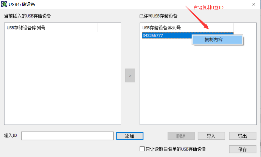 此外,还可以将U盘ID批量导出和导入以及设置“只让读取白名单的USB存储设备”的功能,就可以实现只让白名单的U盘只让读取而禁止写入了,从而进一步防止复制电脑文件到U盘的行为。