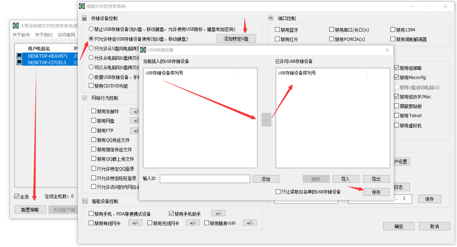 首先,在界面上勾选“只允许特定USB存储设备使用”,然后点击后面的“添加特定U盘”,如果这个时候插入了U盘,则就会在左侧看到U盘的ID,然后鼠标点击选中,再点击中间的右向箭头,即可将此U盘的ID添加到右侧的列表中(白名单),然后这个U盘就可以使用了。如果有多个U盘,则需要添加多个ID,较后点击“保存”即可,如下图所示:
