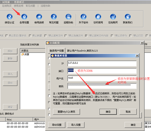然后打开“大势至局域网共享文件管理系统”,点击“全局配置”,这里修改端口为3306,同时修改密码为您安装数据库时设置的密码。如下图所示: