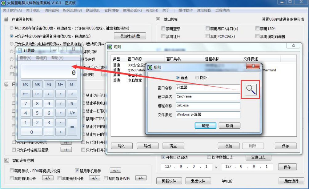 如果不确定关键词,可以通过“深度检测程序特征”功能来确定。打开要禁止的程序,拖动放大镜到程序窗口,自动读取程序特征,点击确定,然后保存即可。