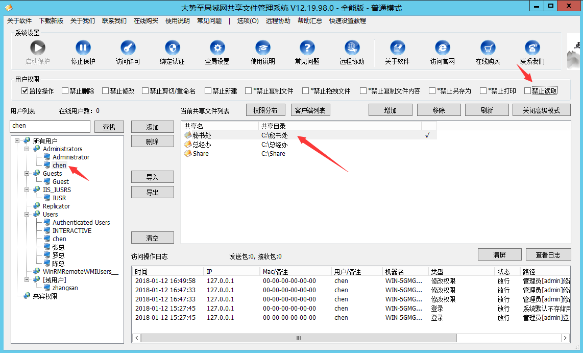 总之,大势至局域网共享文件夹权限设置软件是当前国内专门面向服务器共享文件安全管理的软件,可以在操作系统之外提供精细的共享文件权限管理,防止越权访问共享文件的行为,防止共享文件泄密事件的发生。同时,系统提供了全面的共享文件访问日志记录,可以详细记录共享文件的访问时间、动作、访问者的IP地址、MAC地址和登录账户等信息,便于网管事后备查和审计。