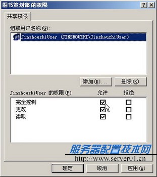 第3步,返回“图书策划部 属性”对话框,在“JinshouzhiUsers 的权限”列表中选中合适的权限(如允许完全控制的权限),并单击【确定】按钮,如图2所示。
