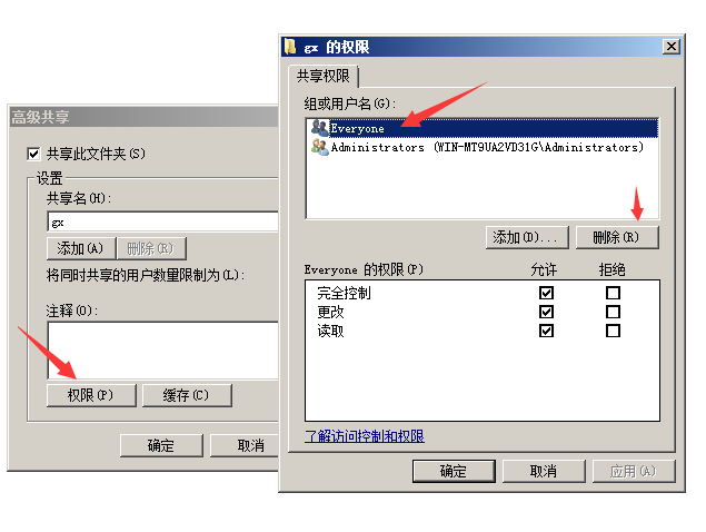 然后,点击“权限”,再单击选择“everyone”,然后点击“删除”,这里删除了erverone权限,就意味着不是所有人都可以访问共享文件,而只有将用户添加到这里的用户才可以访问共享文件。如下图所示: