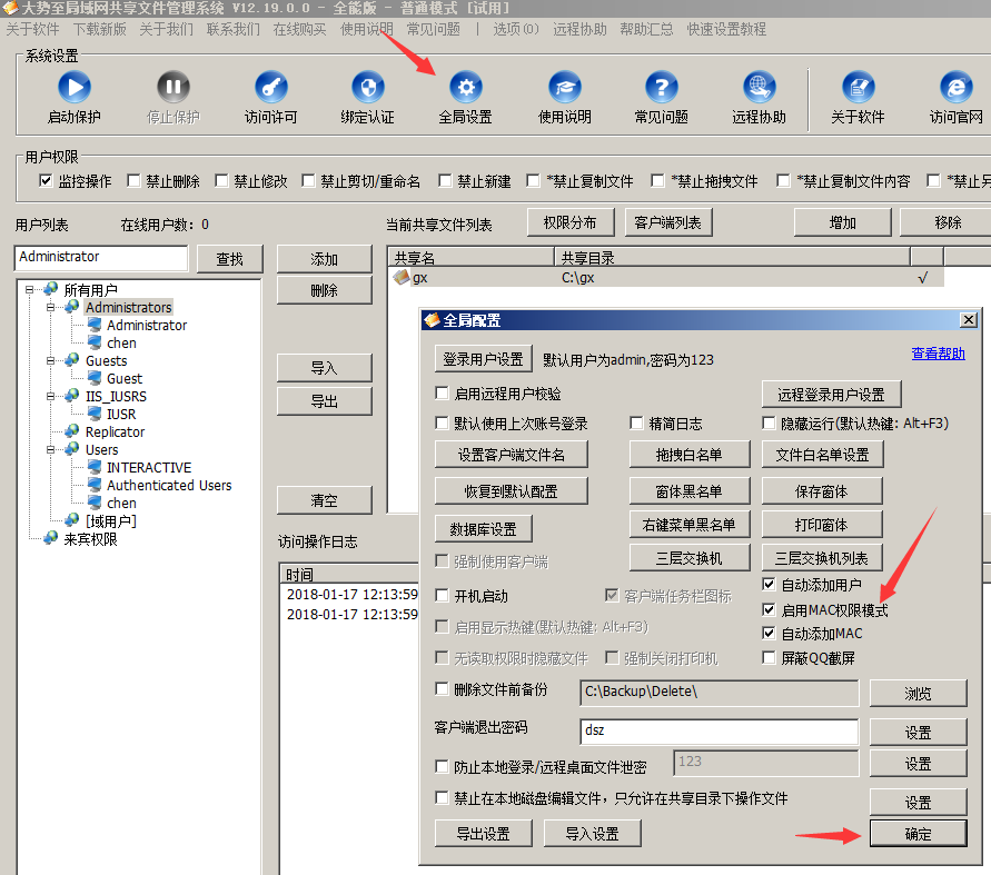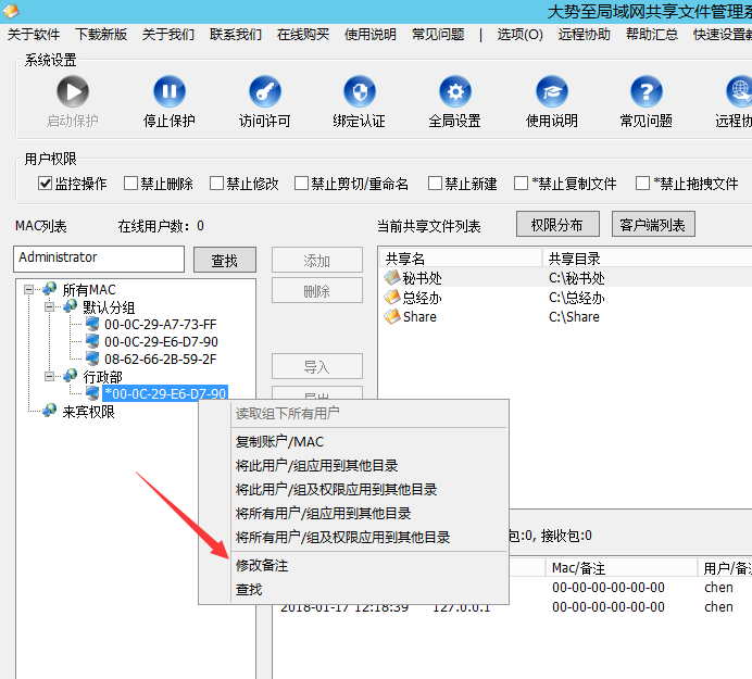 在大势至共享文件夹监控软件上,点击“全局配置”,然后勾选“启用mac权限模式”,此时用户列表框将会出现正在访问的用户电脑MAC地址,然后就可以按照为用户设置权限的方式,为不同的MAC地址设置不同的访问权限,这样就真正实现了文件夹共享给指定用户、文件夹共享给指定电脑了。如下图所示: