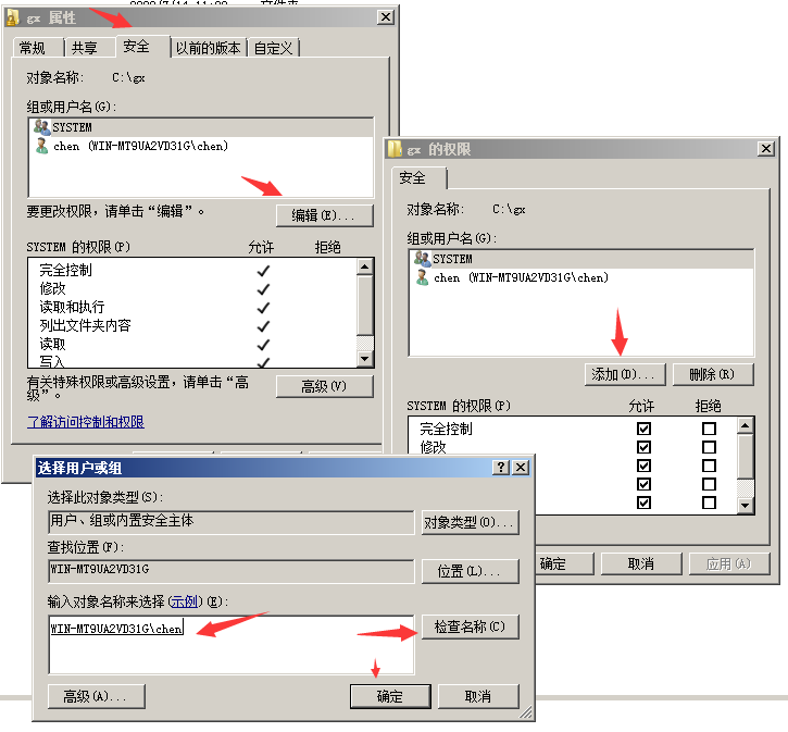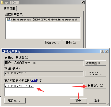 我们同样,在这里点击“添加”,然后输入服务器上已经有的账号(chen),点击“检查名称”,并点击“确定”,即可。如下图所示: