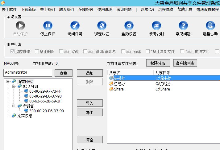 虽然通过用户账号可以设置文件夹共享给指定用户,但如果想实现文件夹共享给指定电脑,则需要在服务器上为每台电脑设置一个账号。如果局域网电脑数量较多的情况下,则需要创建的用户账号将会比较多。此时,你也可以通过“大势至共享文件管理软件”的“启用mac权限模式”,来基于MAC地址来识别用户,并基于MAC地址设置访问权限的方式实现文件夹共享给指定用户。具体设置如下: