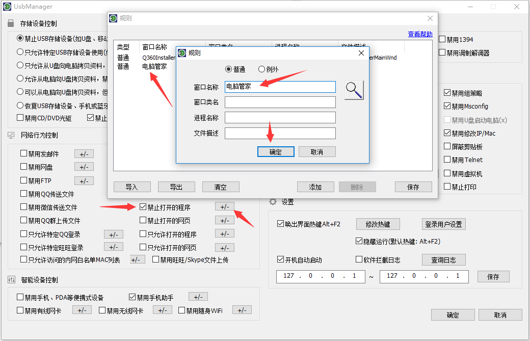 当然,用户可能还会同时安装其他同类软件,这种情况下,我们建议用户禁止用户安装。比如“QQ电脑管家”(当然你也可以禁止安装360安全卫士,添加“360安全卫士”即可),在管理端点击“禁止打开的程序”,然后这里添加“电脑管家”四个字,然后指派给客户端电脑,这样局域网电脑就无法安装QQ电脑管家了。当然,如果用户已经安装了,则你需要手动将其卸载,然后就无法再次安装了。如下图所示: