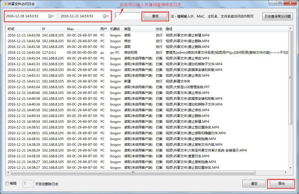详细记录用户和管理员对服务器共享文件的操作日志,包括删除、修改、复制、剪切、重命名、新建等行为,也包括用户名、计算机名、文件名、路径、IP地址、MAC地址等。监控日志可设置自动删除和导出。