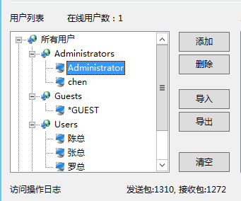 系统会自动读取本地所有的用户帐户,包括管理员帐户、USER用户、GUEST账户和域用户。同时,系统也支持增加、减少、删除、清空、导出等操作,便于随时设置共享文件访问权限的用户。