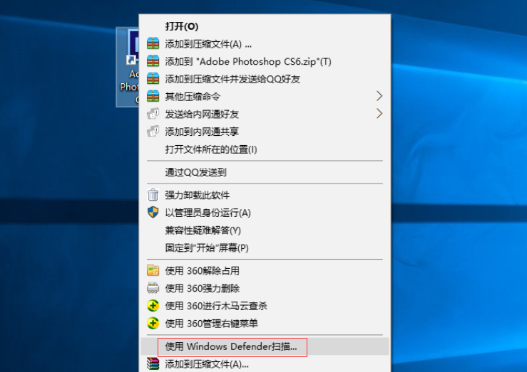 右击桌面一个文件,选择“使用windows defender扫描”,打开windows defender;
