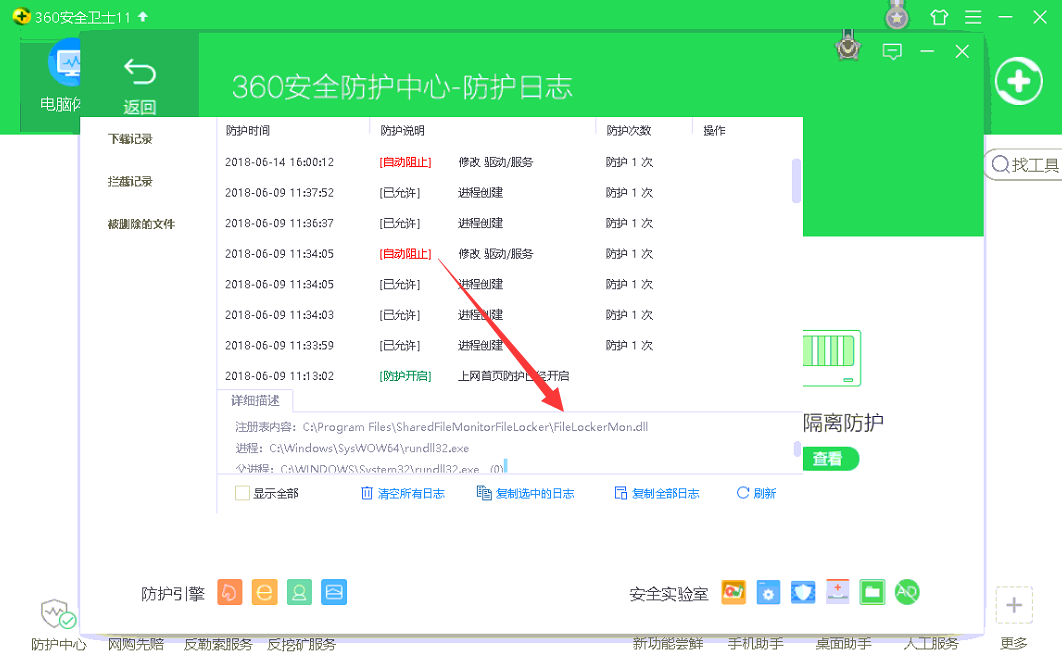 同时,即便由于我们添加了FileLockermain.exe的白名单,但是360安全卫士依然还会进行默认拦截,如下图: