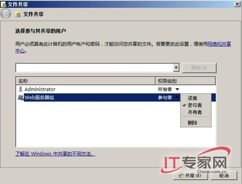 下面我们需要为共享配置文件夹授权,通常情况下我们在文件夹服务器中进行授权就可以了。如果你们是环境是域环境的话,需要登录域控制器进行授权,当然这也是笔者推荐的方式,我们就以此为例进行演示。以域管理员登录域控制器,我们在D盘根目录中创建一个名为“Websites”的文件夹,然后在”文件”菜单点击“共享”弹出共享对话框。在“文件共享”对话框,点击“更改共享权限”,在“文件共享”对话框,输入“Web管理员组”,然后点击“添加”。接下来,将在“权限级别”为“Web管理员组”的权限为“参与者”。在“文件共享”对话框,输入“Web服务器组”,然后点击“添加”。在“权限级别”,更改”Web服务器组”的权限为“参与者”,然后点击“共享”。较后,点击“完成”关闭“文件共享”对话框。需要说明的时,这里的“Web管理员组”是笔者在域控制器中创建的一个用来进行Web服务器管理的组。通过组来授权比较方便,当然大家可根据实际情况为个别用户授权或者为其他的组授权。(图4)