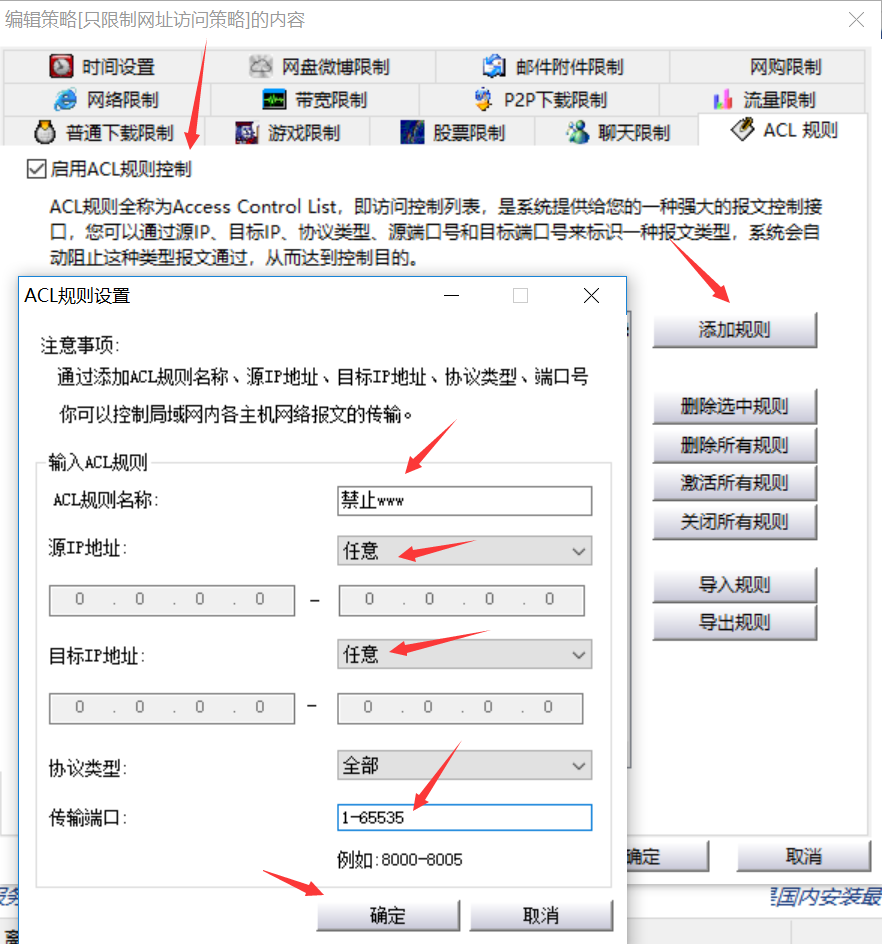 打开聚生网管软件上网控制策略里面的“acl规则”,然后输入添加ACL规则。例如“禁止WWW”,然后添加端口1-65535,源IP地址和目标IP地址都选择“任意”,协议选择“全部”,然后点击“确定”,这样我们就禁止了电脑所有端口的通信,使得所有的网址都无法访问,如下图: