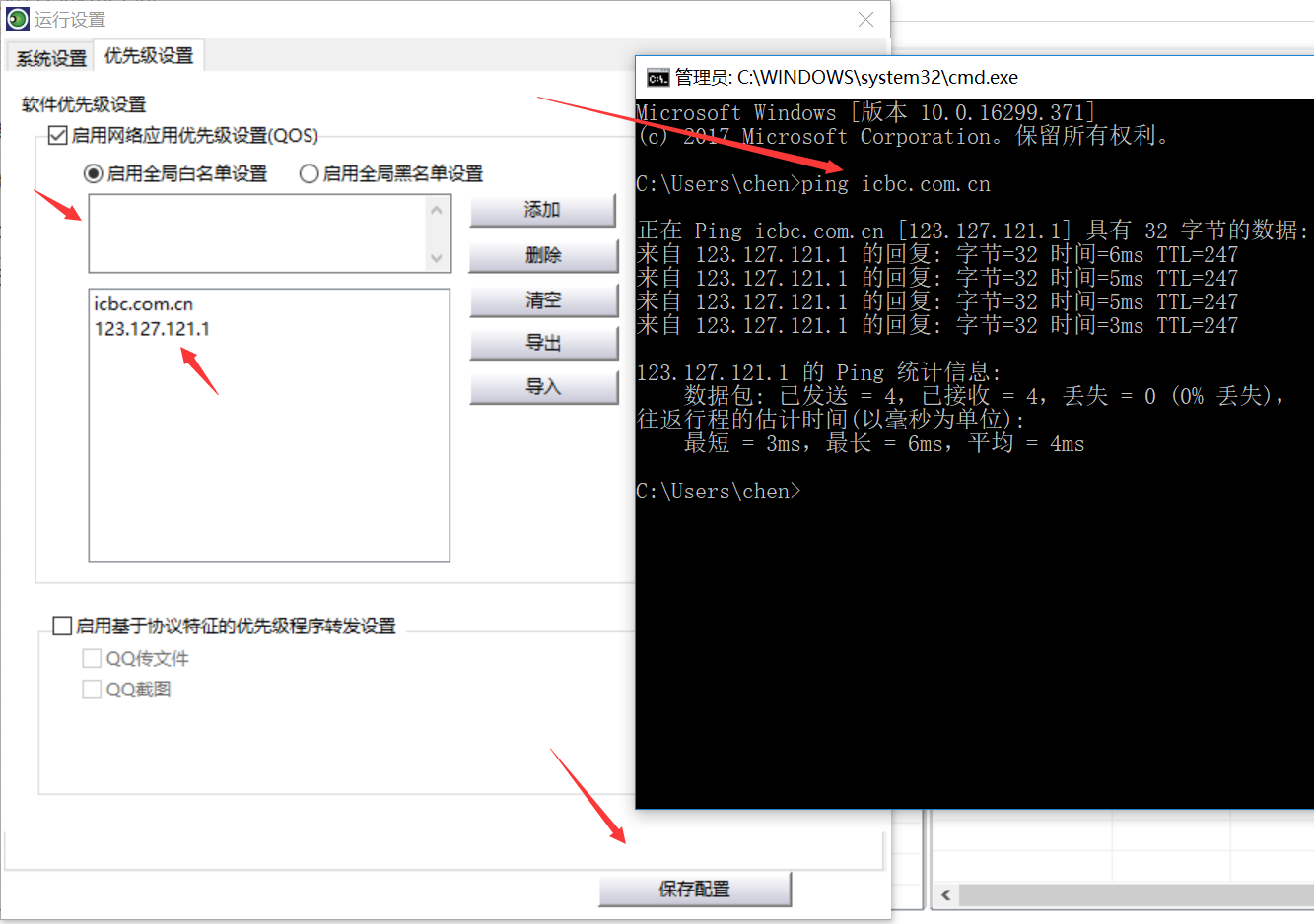 然后,我们在聚生网管界面上点击“全局设置”,点击“优先级设置”,然后添加我们许可访问的网址,如“icbc.com.cn”,这样相当于“例外”设置,因为在“全局白名单”的网址将不受ACL规则拦截的影响,从而就可以访问了。但是,由于icbc.com.cn也是https的网站,因此我们还需要添加其对应的IP地址,毕竟单纯依靠网址将无法解析。我们可以通过ping来获取icbc.com.cn对应的IP地址,然后添加进去,保存即可,如下图所示: