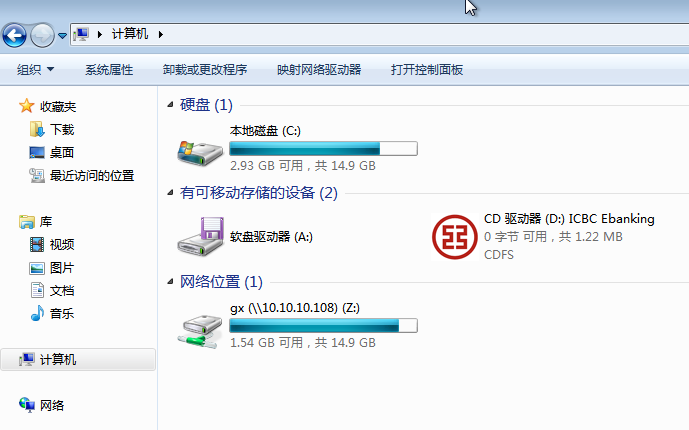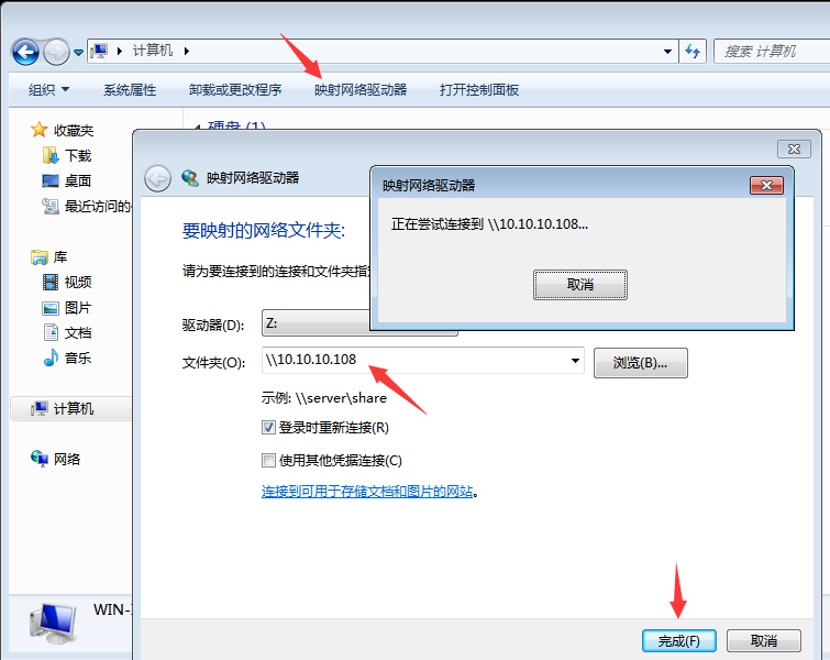 同时,为了方便,我们可以将其映射到本地磁盘,方法:在客户端电脑点击“计算机”,然后点击顶部的“映射网络驱动器”,然后在“文件夹”框内输入服务器的IP地址,等待连接成功后,点击“完成”按钮即可。如下图: