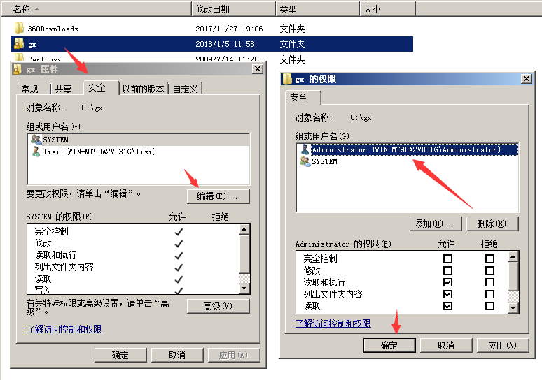 然后,我们需要在操作系统里面设置共享文件只让某个用户访问。方法:右键点击某个共享文件,选择“属性”,然后切换到“安全”,然后点击“编辑”,选中禁止访问此共享文件夹的账号点击“删除”,再点击“添加”,添加允许访问此共享文件夹的账号,如下图: