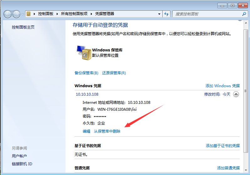 如果之前曾经勾选了“记住我的凭据”,则需要切换访问共享文件的账号时,则需要删除以前系统保存的凭据。方法:开始,运行,cmd,右键以管理员运行,然后输入“control keymgr.dll”,回车后会弹出凭据保管库,直接删除就可以了。如下图: