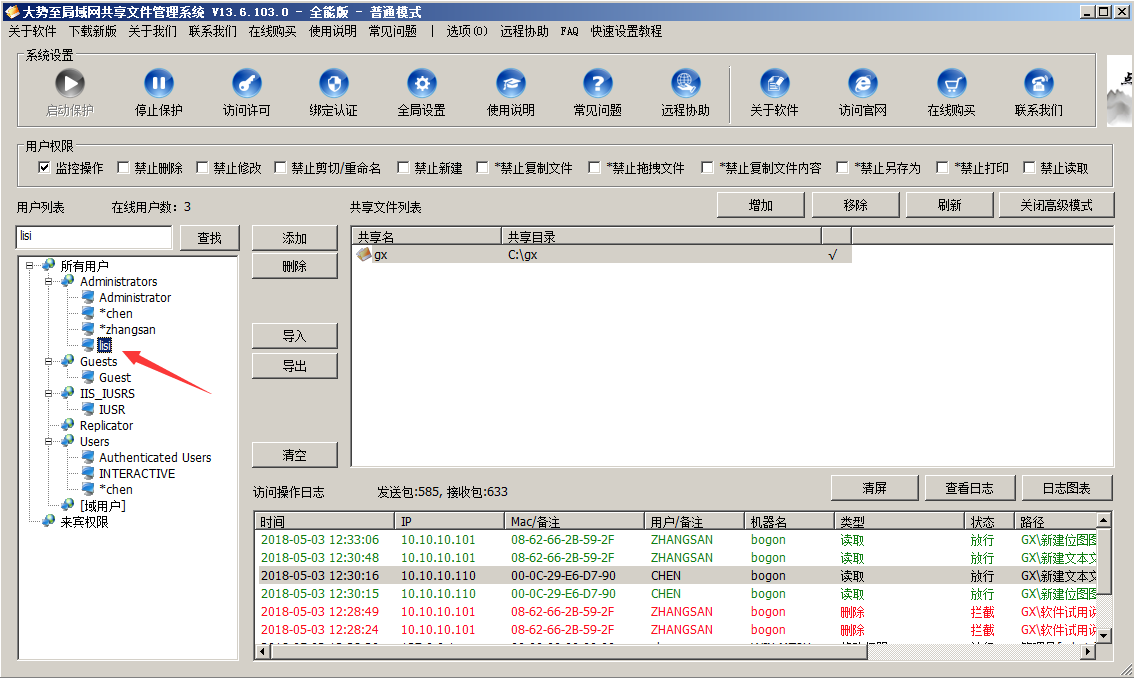 同时,通过大势至共享文件管理系统还可以与操作系统共享文件权限设置协同使用,可以实现只让特定用户访问特定共享文件,只让访问者查看自己有权限访问的共享文件而禁止查看无权限访问的共享文件,并且在即便是对于有权访问共享文件的用户,还可以进一步限制其访问权限,从而较大限度保护共享文件的安全,防止共享文件泄密风险的发生。