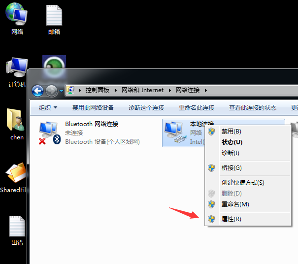 然后这里右键点击“本地连接”,选择“属性”,如下图: