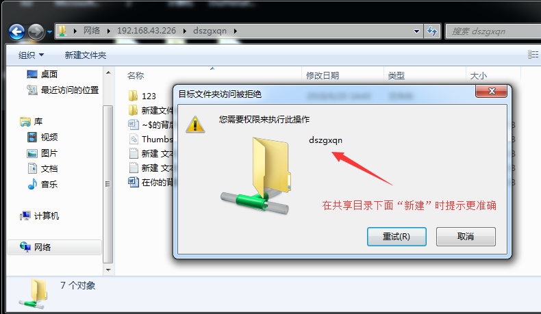这样,用户即便在没有安装客户端、没有访问权限的情况下,在共享目录下面点击“新建”的时候就不会再卡死了,同时访问日志的提示更为精准。如下图: