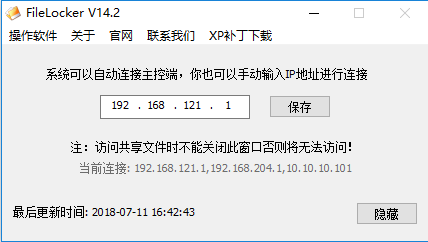 方法1:可以把"Filelocker”直接发给用户,双击即可运行,如果访问共享文件的电脑和共享文件服务器不再同一个局域网,则需要输入共享文件服务器的IP地址,并点击“保存”,使之可以正常连接到管理端,方可正常访问共享文件。如下图: