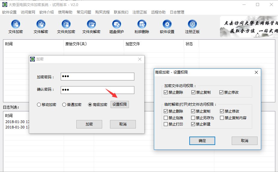 与上面的加密软件不同的是,大势至U盘加密软件(下载地址:http://www.grabsun.com/dnwjjm.html)不仅可以加密U盘文件,而且还可以加密电脑磁盘文件,而且还可以实现限制加密文件的二次访问权限。比如,可以只让读取加密文件而禁止复制加密文件、只让修改加密文件而禁止删除加密文件、只让打开加密文件而禁止保存加密文件,以及禁止拖动加密文件、禁止打印加密文件等,全面保护电脑文件安全。