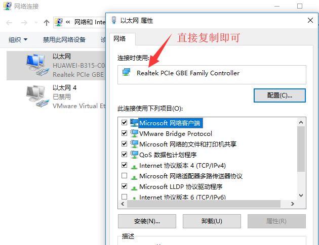 然后我们继续右键点击“本地连接”(上图的“以太网”)的“属性”,这里可以直接复制网卡的描述。如下图: