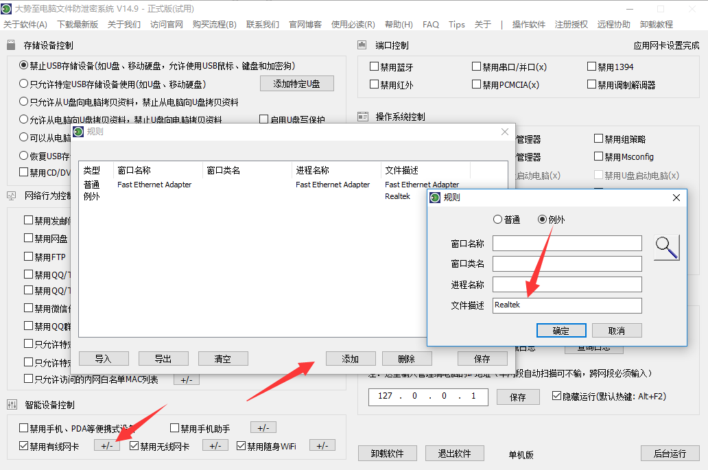 大势至电脑文件防泄密系统集成了禁止有线网卡、禁用无线网卡、禁用随身wifi等功能,可以有效控制网卡使用,防止网卡扩展应用的启用。具体设置如下: