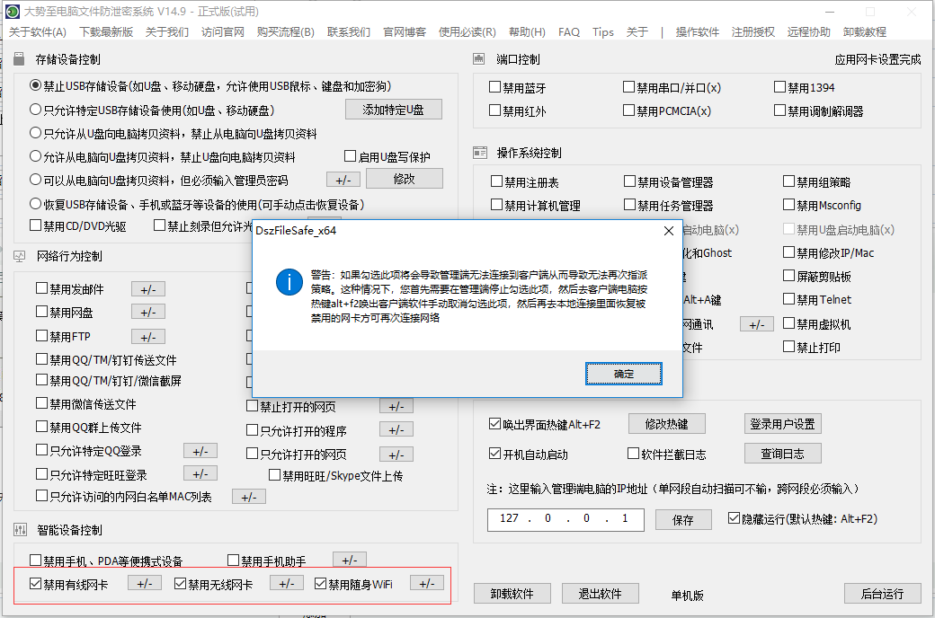 值得注意的是,如果是网络版,则强烈不建议你勾选“禁用有线网卡”(通常和管理端通讯是基于有线网卡),否则将会导致由于网卡被禁用而导致管理端无法和客户端通讯,从而导致管理端无法向客户端指派策略。如果你不小心禁用了有线网卡,则首先需要在管理端取消勾选“禁用有线网卡”,然后到客户端按alt+f2唤出软件界面,然后取消勾选“禁用有线网卡”方能正常连接到管理端。