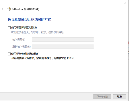 2、出现“选择解开此驱动器的方式“界面时,选则“使用密码解锁驱动器”项,并输入密码,确认,点击下一步。