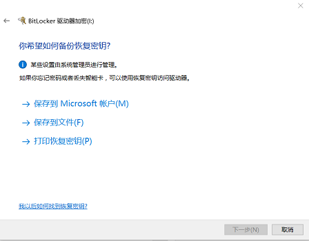 3、弹出“选择加密的驱动器空间大小”后,根据需要进行选择,选择密钥导出方式,将密钥保存在容易找到的地方。点击“下一步”。