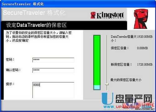 左边是设置密码区(一定设置密码),并且能够输入密码提示。而右边是用来设定保密区容量大小的,设置方法为点击滑动区拖动,较大保密区空间为1728MB,每个U盘只能设置一个保密区。
