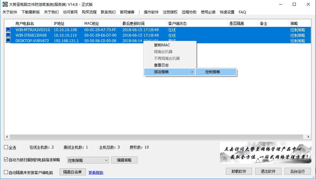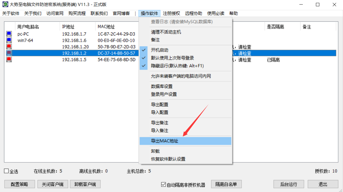 同时,可以在软件界面的“操作软件”菜单里面,选择“导出MAC地址列表”,则可以导出所有电脑的MAC地址,然后指派策略时批量导入即可,如下图所示: