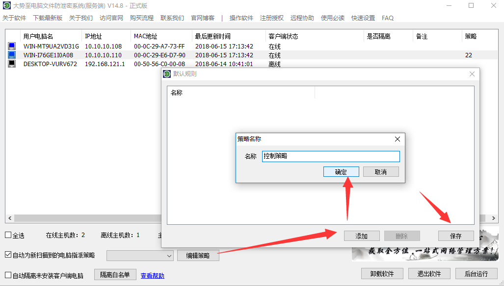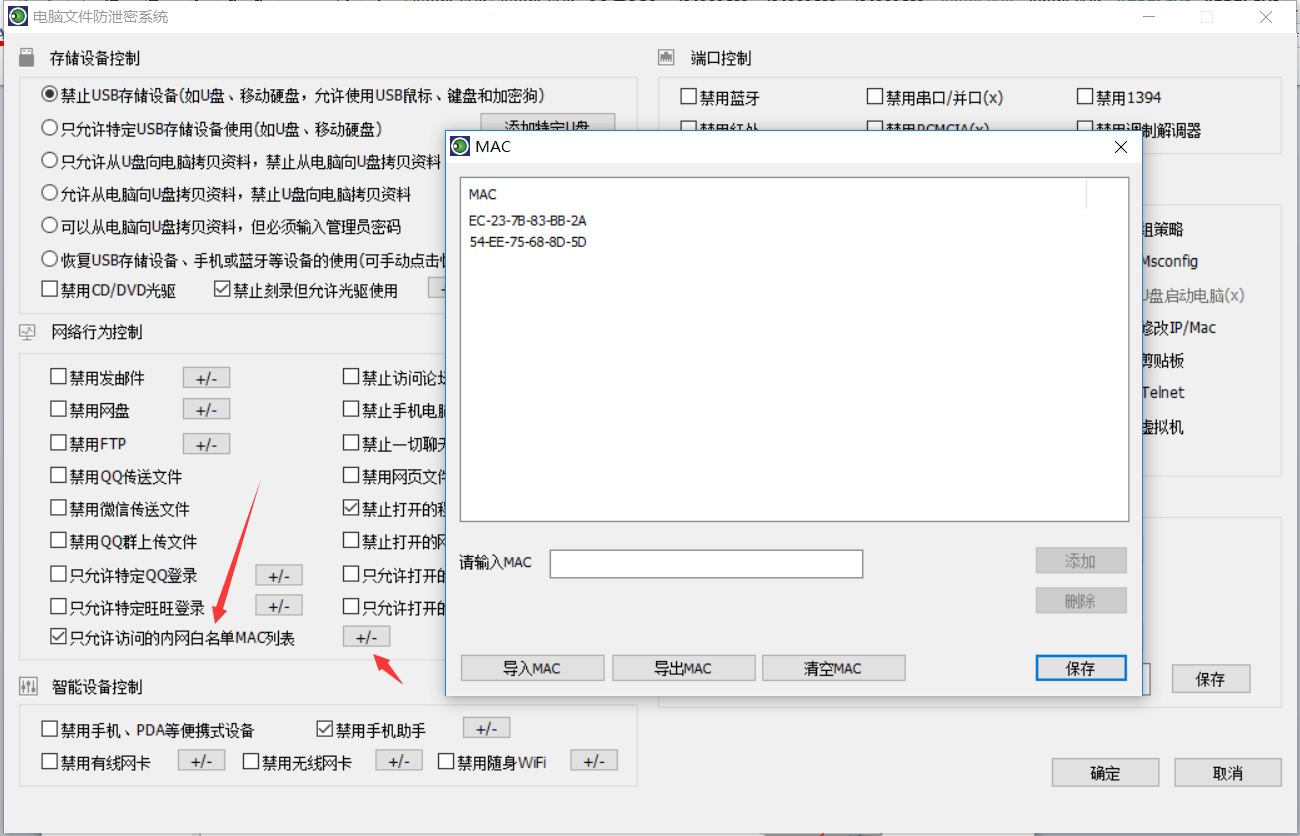 大势至数据防泄漏软件(点击下载)集成了“只允许访问内网的MAC白名单列表”功能,通过此功能可以设置安装了“大势至电脑文件防泄密系统”的客户端电脑只让访问某些电脑,或者只让某些电脑访问的行为,从而极大地保护了网络安全,防止外来电脑访问内网。