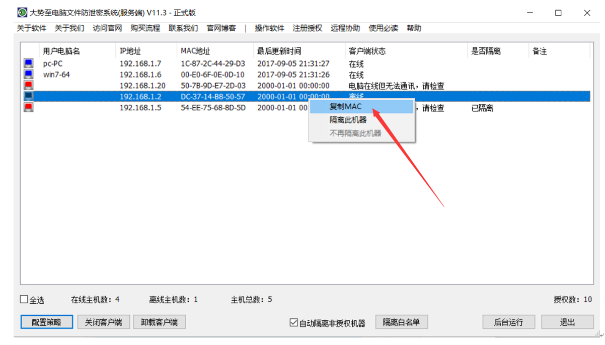 同时,添加MAC地址的方法也不用手工输入,可以在软件的主机列表的某个主机上面右键点击,然后点击“复制MAC”即可,然后在刚才MAC地址输入窗口这里粘贴,添加,保存即可。如下图所示: