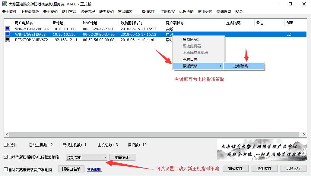 此功能启用的方法(注:单机版可以直接在界面上启用,无需通过管理端配置):鼠标单击选择单个或批量主机,然后点击下面的“配置策略”。如下图所示: