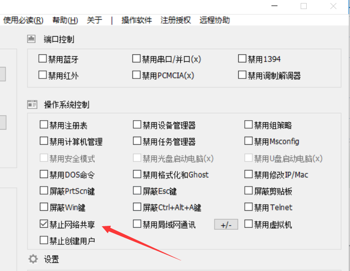 此外,为了进一步保护电脑文件安全,禁止局域网电脑私自设置共享文件,防止通过自己携带外来电脑访问公司电脑共享文件的行为。在软件界面上勾选“禁止网络共享”即可。如下图所示: