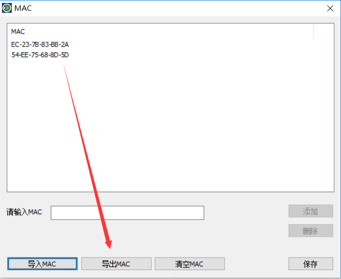 同时,为了确保客户端电脑可以与管理端通讯,并可以访问互联网,所以在批量导入MAC地址之前,建议先将网关的MAC地址和管理端的MAC地址导出,然后将其复制到要批量导入的MAC地址表中,然后再全部导入即可。如下图所示: