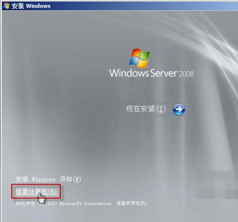 把 Windows Server 2008 的安装光盘插入到光驱并 设置从光驱引导,在出现安装界面时选择“修复计算机”。如图: