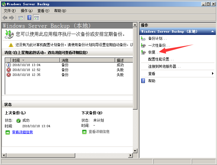 同样,在“开始”程序菜单点击“Windows Server Backup”,然后点击右侧的“恢复”。如图: