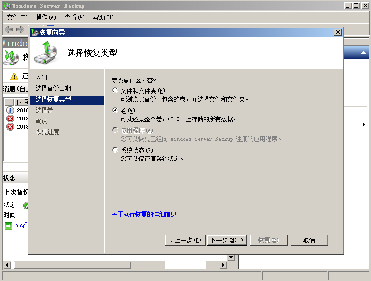 然后,我们可以选择恢复的类型。既可以选择文件夹,也可以还原整个卷,甚至还可以还原系统状态。我们选择“卷”,如图: