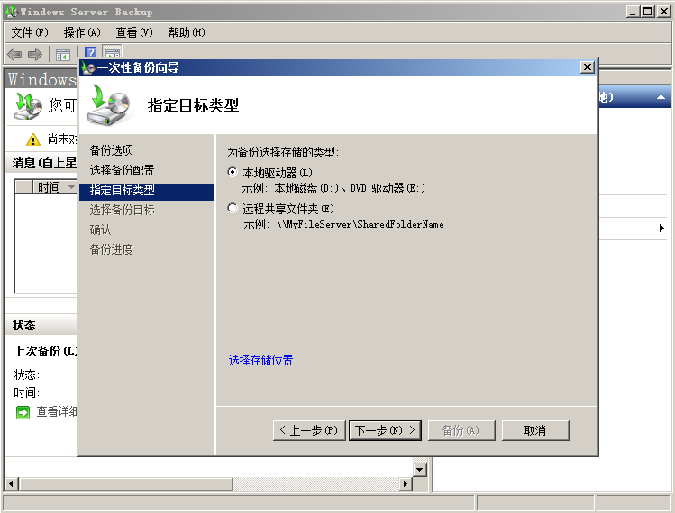 然后我们选择备份文件的存储路径,如本地硬盘或网络路径,根据自己的需要进行选择。一般选择“本地硬盘”,比如外接移动硬盘等。如下图: