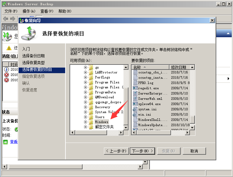 如果我们选择恢复“文件和文件夹”,则可以选择“Windows”文件夹。如图: