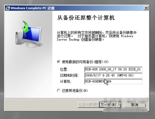 如果系统宕机,无法启动,这就需要用 Windows Server 2008 安装光盘引导 系统,进行系统备份还原了。