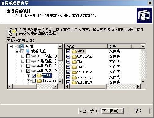 在左侧选择需要备份的目录,也就是您网站程序所在的路径。例如我们要备份E盘根目录下i386文件夹内的所有文件,那么点开E盘选中i386前的方框即可。
