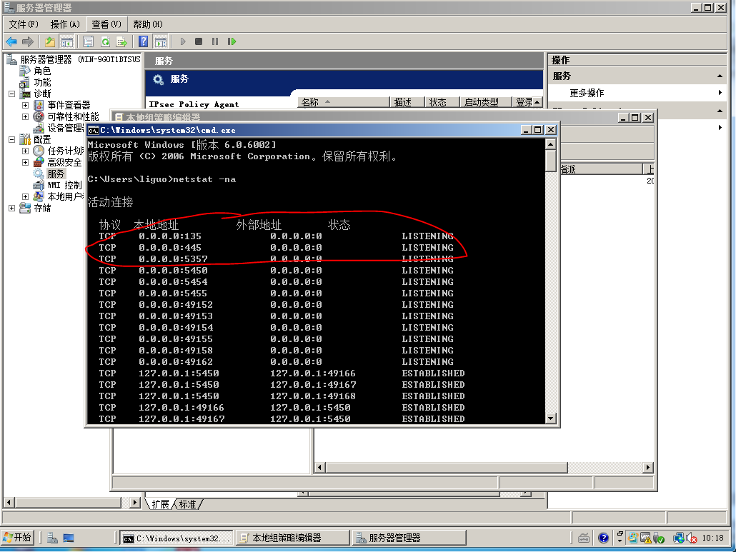 1、检查端口开放情况(是否开放了137、139、445、3389端口),本机cmd命令netstat –an 查看端口监听情况,