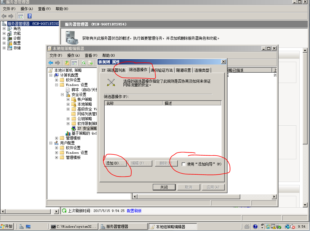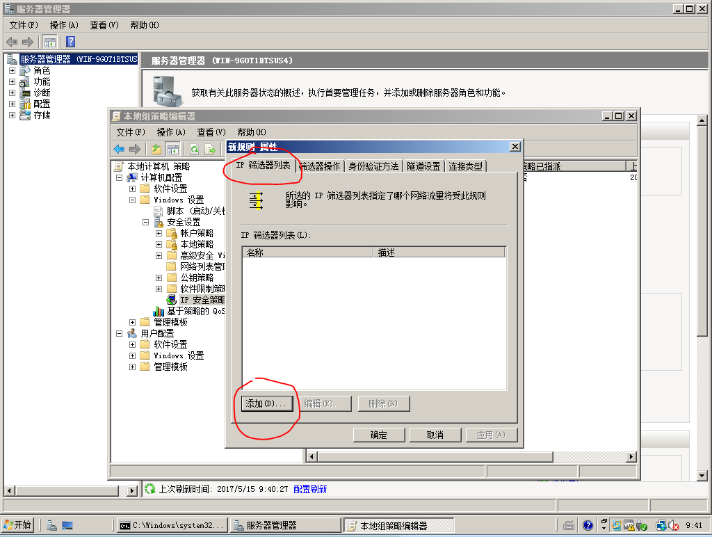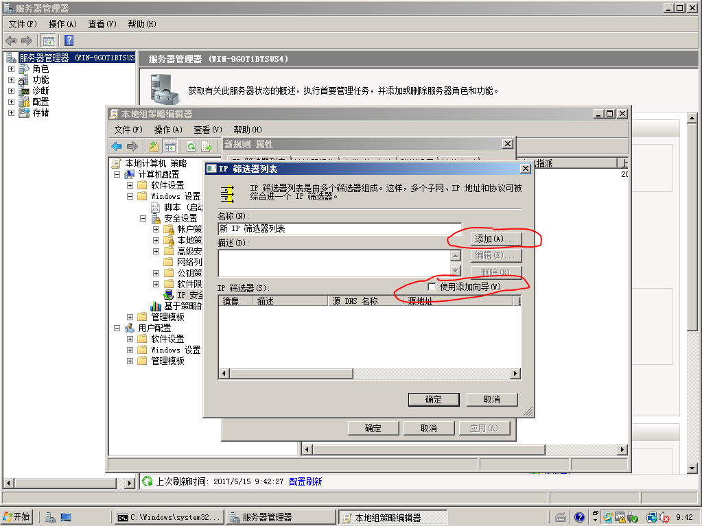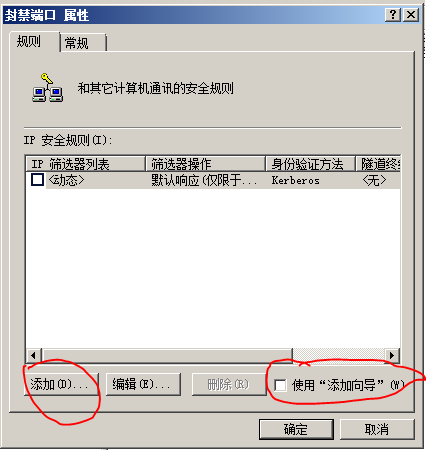 在IP筛选器列表窗口中,单击右侧的添加按钮,需要注意的是这里也不要点击右下角的”使用添加向导”
