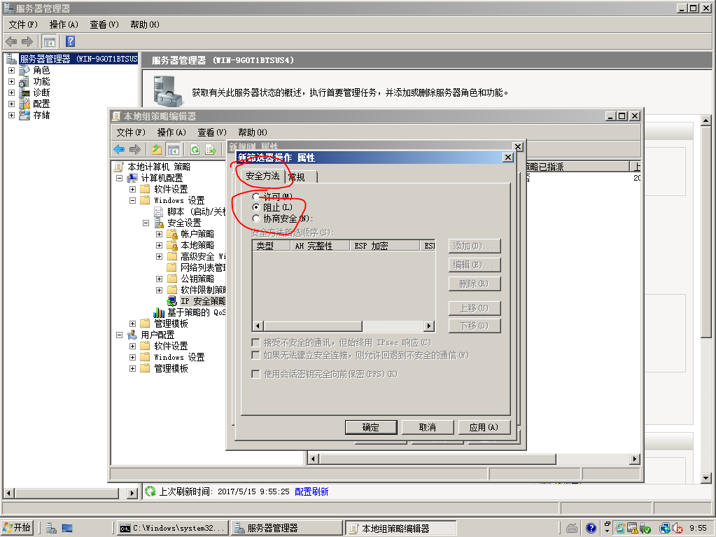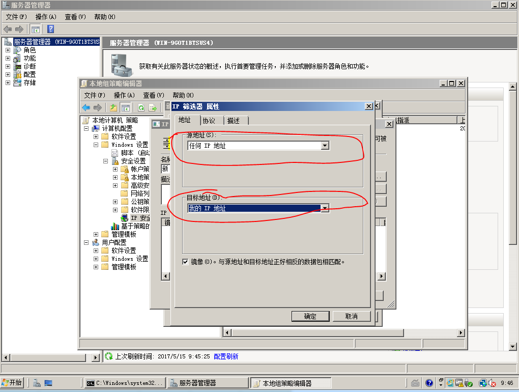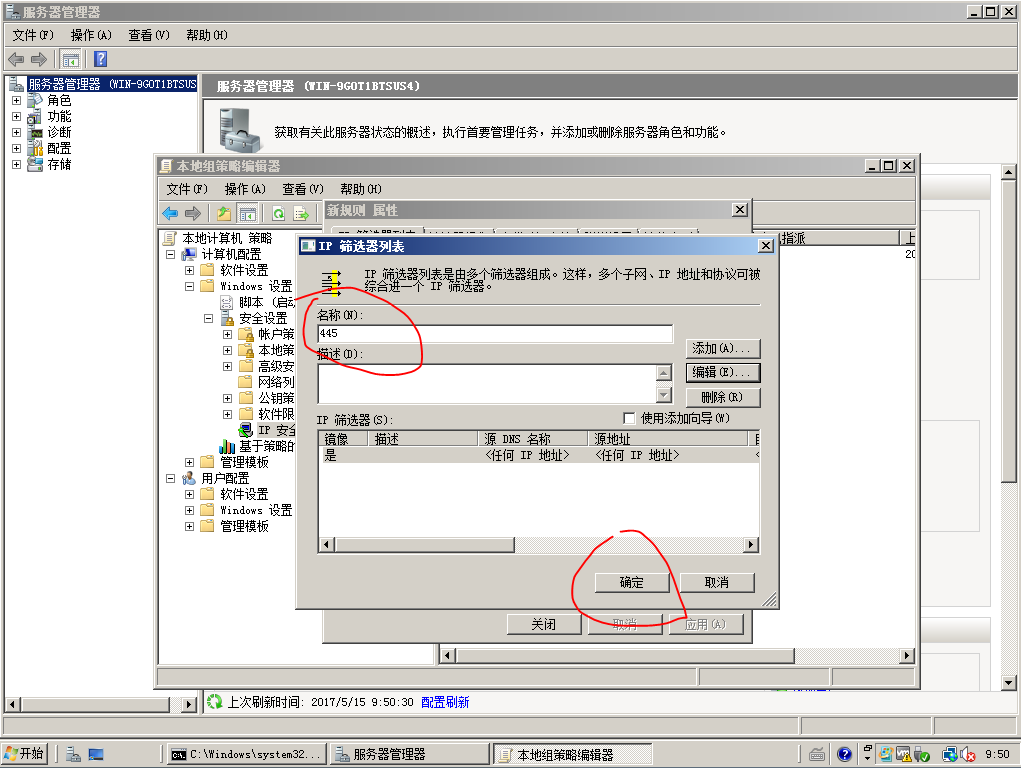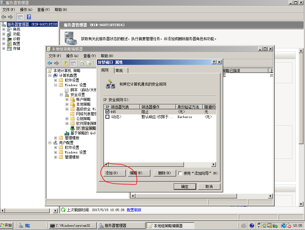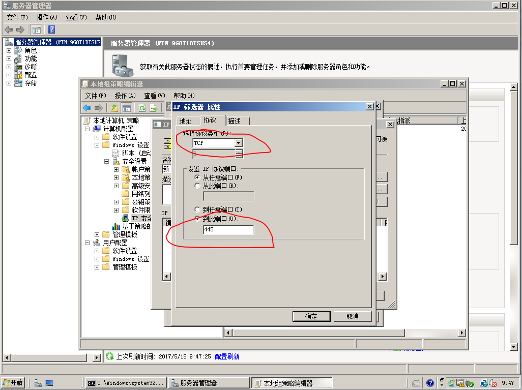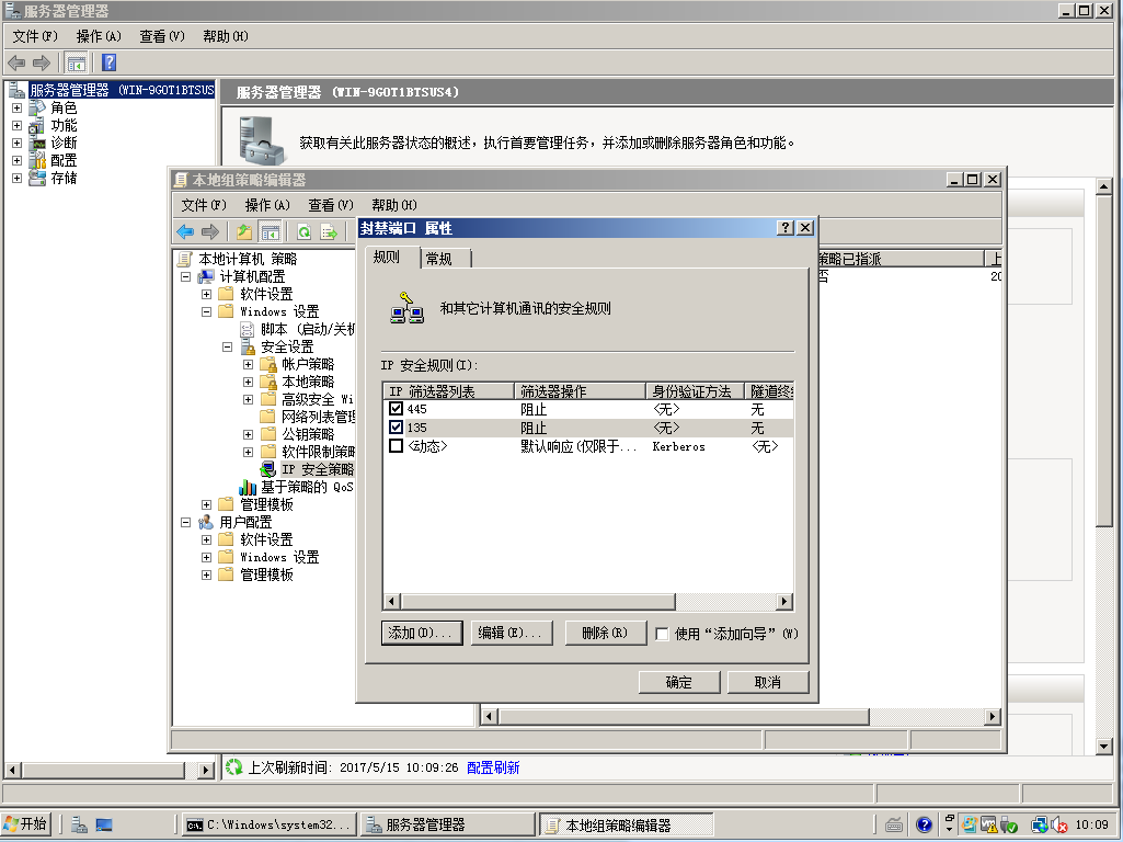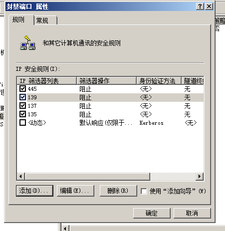 出于安全的考虑,建议两种方法都使用了,防火墙禁止了端口,ip组策略也禁止了端口。